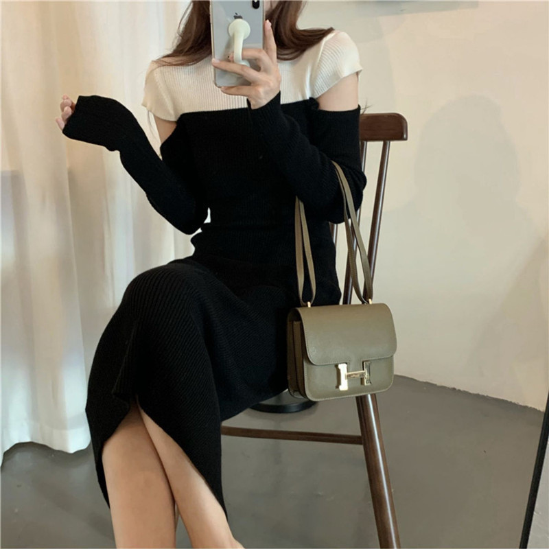 French Waist Red Stitching Off-Shoulder Knitted Dress Women’s Autumn And Winter Niche With Coat Bottoming Long Skirt